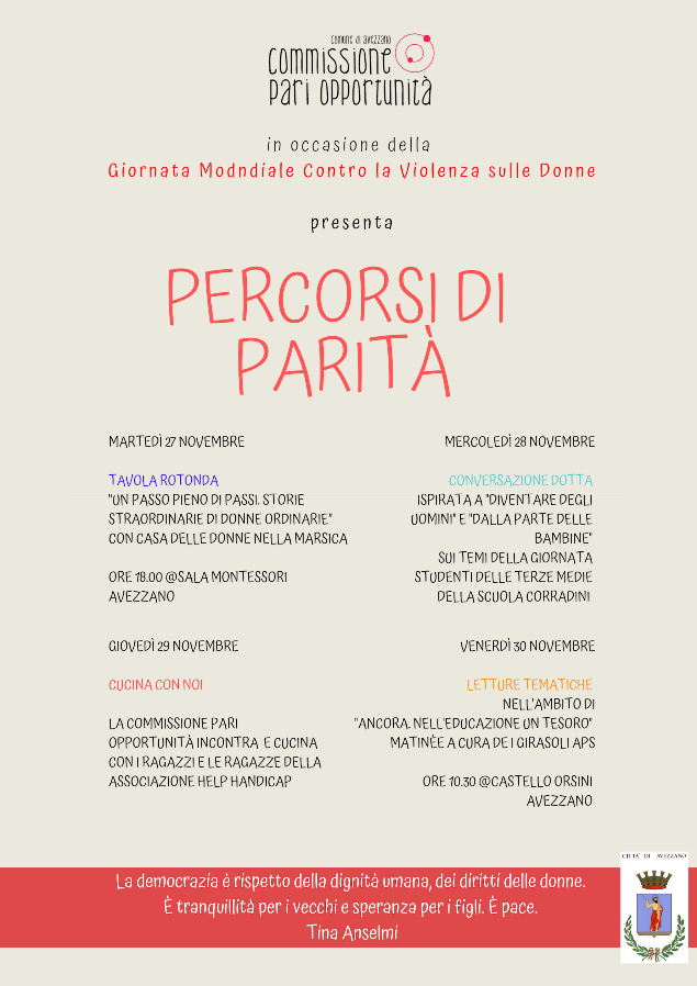 La Commissione Pari Opportunità del Comune di Avezzano intende dedicare azioni e ragionamenti propositivi a questo tema e a quelli correlati ad esso come le discriminazioni, le disparità nel mondo del lavoro e il mancato riconoscimento dei fondamentali diritti civili organizzando una settimana che andrà dal 26 al 30 novembre dal titolo “Percorsi di Parità”, fatta di una serie di piccoli, significativi eventi.