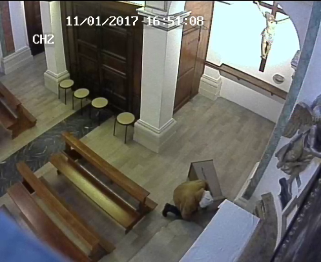 Lì ha letteralmente scardinato la base in legno, ma l’interno era vuoto in quanto i responsabili della chiesa avevano già svuotato il contenitore. In seguito si è portato nei pressi dei candelabri dove ha comunque cercato di portare via qualcosa ma senza esito positivo.