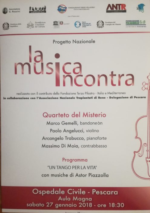 Sabato 27 Gennaio 2018 alle ore 18.30 presso l’Aula Magna del Presidio Ospedaliero di Pescara, si svolgerà, nell’ambito dell’iniziativa di umanizzazione dei luoghi di cura, il Concerto “Un tango per la vita” afferente al progetto Nazionale “La Musica incontra…il sacro, l’arte e la solidarietà”.