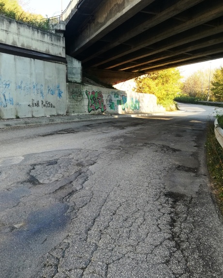 Il viaggio “da incubo” verso l’ateneo inizia lungo la bretella stradale che collega Via De Gasperi con Via Villa Albula, passando al di sotto del Ponte San Gabriele. Proprio in corrispondenza del ponte infatti, sono presenti da mesi estese voragini che interessano entrambe le corsie di marcia. Proseguendo si arriva alla rotonda di “Villa Albula” dove tutti i segnali stradali si presentano danneggiati o inclinati, dopo essere stati incidentati e colpiti. Alcuni sono finiti a terra, altri sono stati rovesciati, altri ancora non ci sono più.