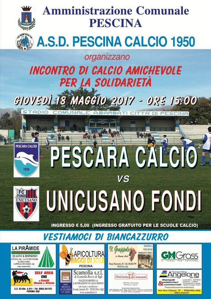 L’Amministrazione Comunale di Pescina e la Asd Pescina Calcio 1950 hanno reso noto che, a causa della improvvisa indisponibilità de L’Aquila Calcio in quanto impegnata nelle finali play off, l’incontro di beneficenza di giovedì 18 maggio alle ore 15 si terrà tra il Pescara Calcio e l’Unicusano Fondi, squadra che milita nella Lega Pro.
